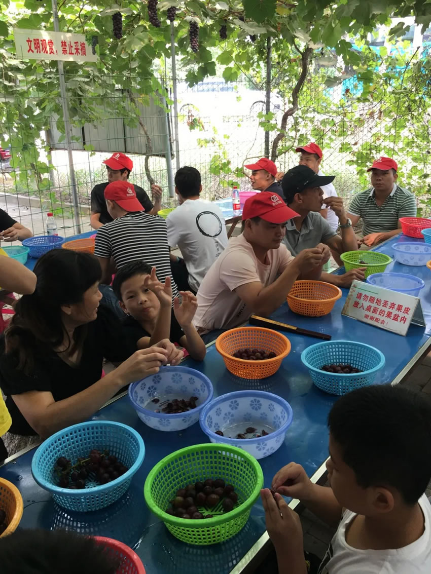 享用完酒店的早餐后,我們一行來到【醇葡鄉(xiāng)村.葡萄】農(nóng)家果園,該果園是目前清遠(yuǎn)最大的高科技葡萄種植園。品嘗了果大味甜的新鮮葡萄后,開心的眾人還在果園里進(jìn)行了舞蹈PK。各組組長帶領(lǐng)組員就公司平日里練習(xí)的舞蹈進(jìn)行比賽。果園老板都被大家的舞姿吸引,詢問“你們是哪里的公司,怎么如此具有活力?”“我們是吉安容器的團(tuán)隊(duì)”大家自豪響亮地回應(yīng)道,讓人感動(dòng)!