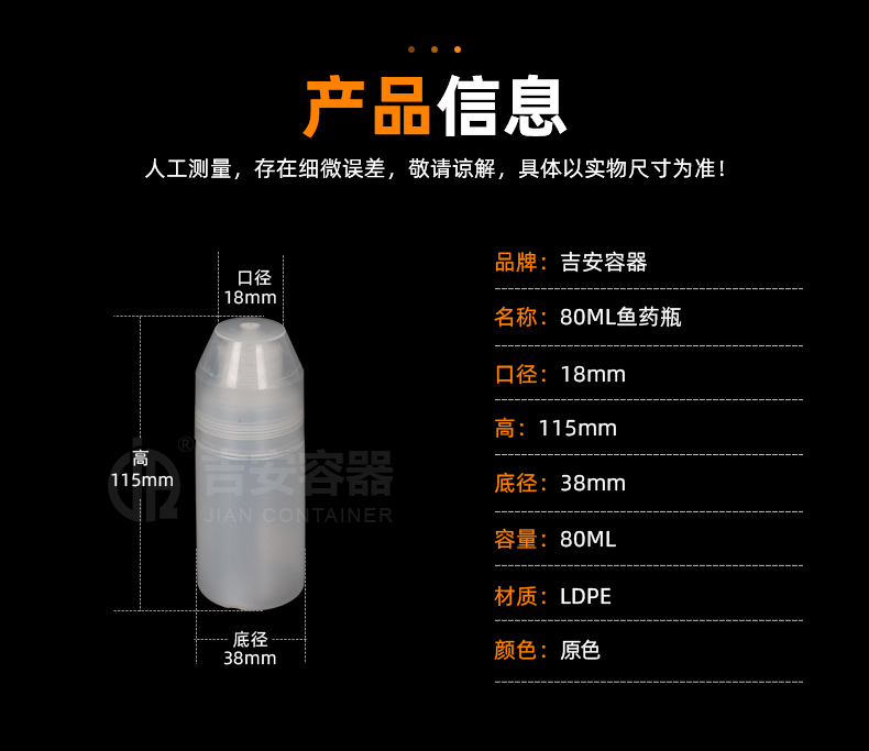 材質(zhì):瓶身-LDPE,瓶蓋-HDPP |