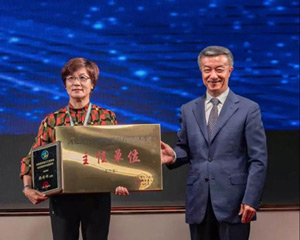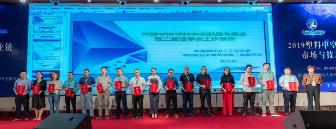 中國塑協(xié)領(lǐng)導(dǎo)為中空制品專委會第四屆理事會成員頒發(fā)銅牌。