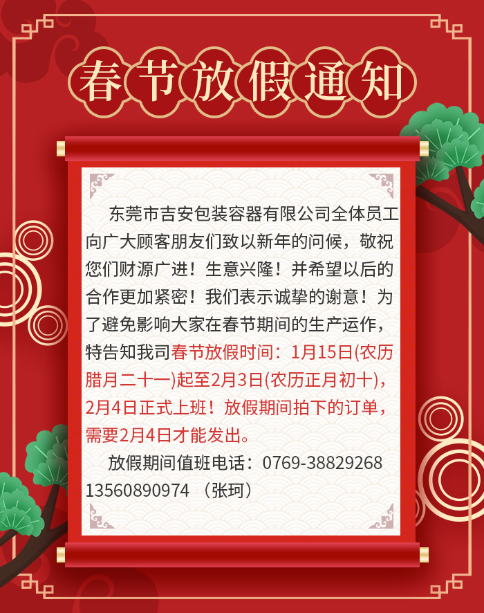 新春復(fù)始,萬(wàn)象更新!非常感謝各位新老客戶長(zhǎng)期以來(lái)對(duì)吉安容器的鼎力支持與關(guān)照,在新春來(lái)臨之際,東莞市吉安包裝容器有限公司全體員工向廣大顧客朋友們致以新年的問(wèn)候,敬祝您們財(cái)源廣進(jìn)!生意興??!并希望以后的合作更加緊密!我們表示誠(chéng)摯的謝意!