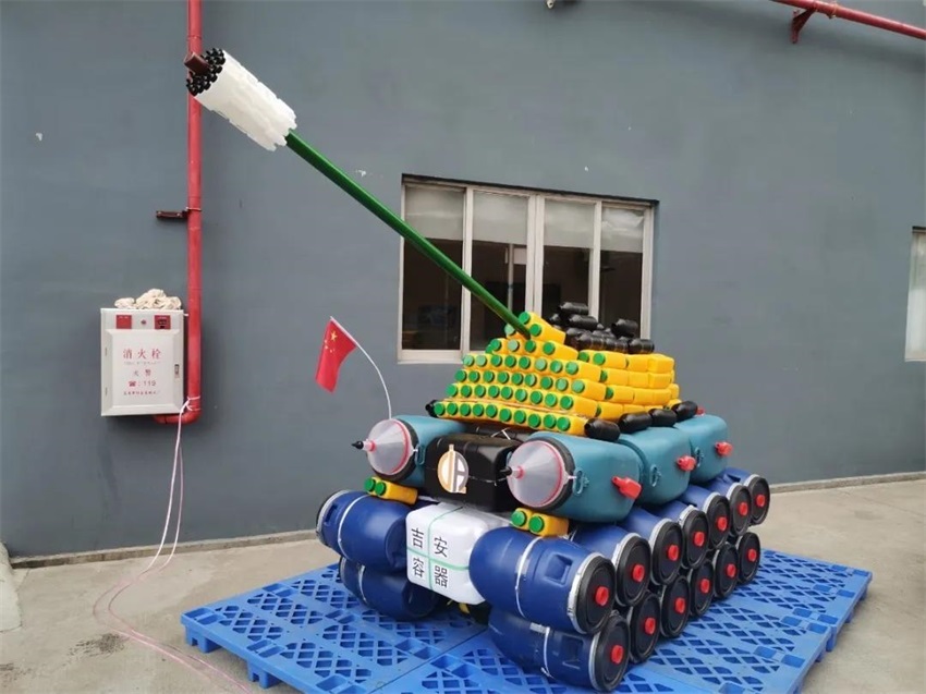 用鐵箍桶組成的坦克,搭配方瓶蓋作為點(diǎn)綴,1L方瓶作為主體,大炮用指甲油瓶拼接而成,方罐、漏斗、圓瓶等采用多系列產(chǎn)品進(jìn)行混搭,居然視覺(jué)上毫無(wú)違和感,整體效果棒棒噠!