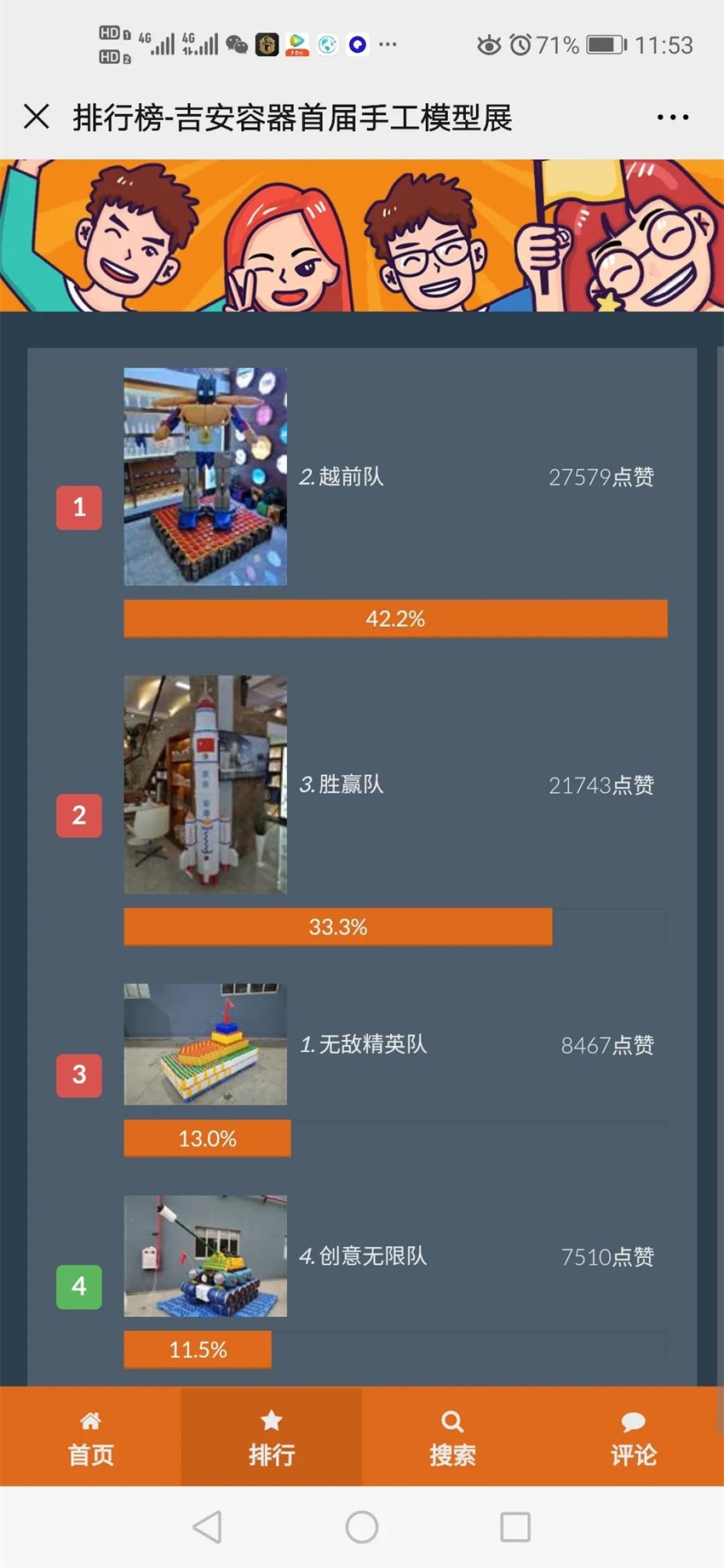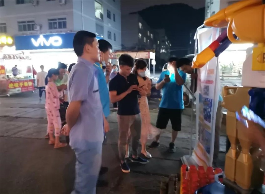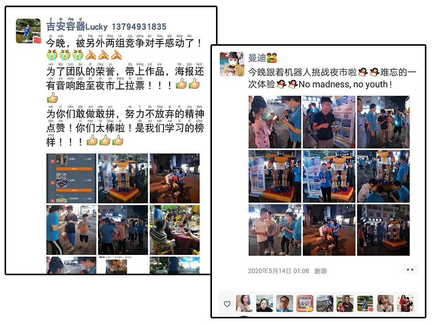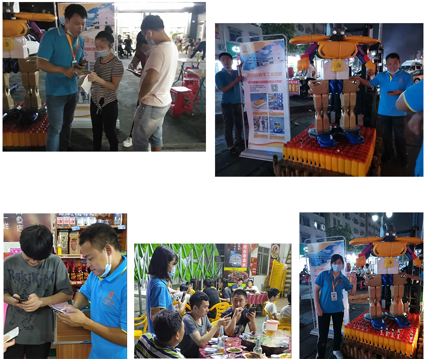 票數(shù)你追我趕,排行榜第一位輪流做,這時(shí)候是提現(xiàn)人脈和拉票技巧的時(shí)候啦!朋友圈也給“吉安大軍”包圍,很快我們也包圍了各自的微信群,各隊(duì)差距變得越來(lái)越不明顯,在雙方展開激烈的線上廝殺之時(shí),越前隊(duì)率先出大招,夜市拉票!他們決定把他們的作品機(jī)器人搬出夜市,勇敢的向別人展示他們的作品,進(jìn)行線下拉票。