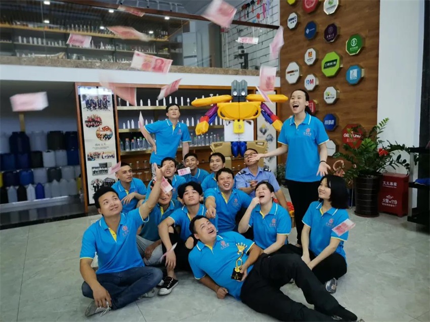 在試用了鐵罐、灰色機(jī)油瓶、膠水瓶等產(chǎn)品均不理想之后,最終敲定采用純色風(fēng)格產(chǎn)品元素搭配藍(lán)色邊框設(shè)計(jì),發(fā)射中的火箭寓意我們團(tuán)隊(duì)業(yè)績(jī)一飛沖天,直沖云霄!