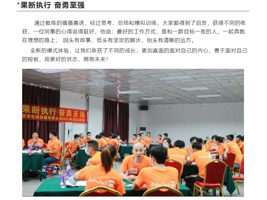 吉安容器2022年度團(tuán)隊(duì)培訓(xùn)如期舉行,前幾次的培訓(xùn)重點(diǎn)是在“拓展”項(xiàng)目中通過(guò)挑戰(zhàn)和趣味性游戲的方式,讓團(tuán)隊(duì)更加直觀的面對(duì)問題,三和團(tuán)建根據(jù)每一次的培訓(xùn)情況,制定科學(xué)方案,拓展項(xiàng)目更多的重點(diǎn)在于如何提高團(tuán)隊(duì)的凝聚力,而今年我們開啟了全新的模式,通過(guò)《沙盤模擬課程》,啟發(fā)大家的全新思維模式,實(shí)現(xiàn)如何有效溝通,如果實(shí)現(xiàn)跨橋梁對(duì)接。