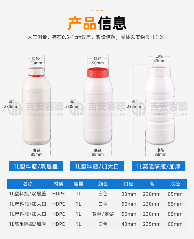東莞市吉安包裝容器有限公司創(chuàng)立于2000年8月1日,是中國知名品牌企業(yè)。已通過ISO 9001質(zhì)量管理體系資質(zhì)認(rèn)證,加入了中國中空協(xié)會,并獲得《中國知名品牌》,《國家標(biāo)準(zhǔn)合格產(chǎn)品》,《全國重合同守信用AAA級企業(yè)》,《質(zhì)量.服務(wù).誠信AAA企業(yè)》等榮譽(yù)稱號。根據(jù)材質(zhì)的不同,我們的產(chǎn)品分為塑料容器、鐵質(zhì)容器、鋁材容器、玻璃容器、紙質(zhì)容器等五大類。按產(chǎn)品的名稱分為塑料桶、塑料瓶、包裝桶、涂料桶、機(jī)油桶、油脂桶、化工罐、膠水瓶、鐵桶、鐵罐、鋁瓶、鋁罐、阻隔瓶、高阻隔瓶等,容量從3ML至1000L多種規(guī)格,多種款式。適合包裝的產(chǎn)品包括:化學(xué)試劑、化工原料、化工助劑、飼料添加劑、油墨、油漆、樹脂農(nóng)藥、日用化學(xué)品、聚氨脂、膠粘劑,廣泛應(yīng)用于化工、建筑、食品、醫(yī)療、生物等各領(lǐng)域。