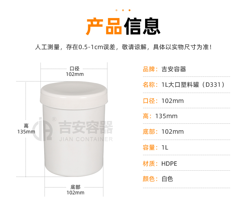 • 產(chǎn)品名稱:1L大口塑料罐(D331)
